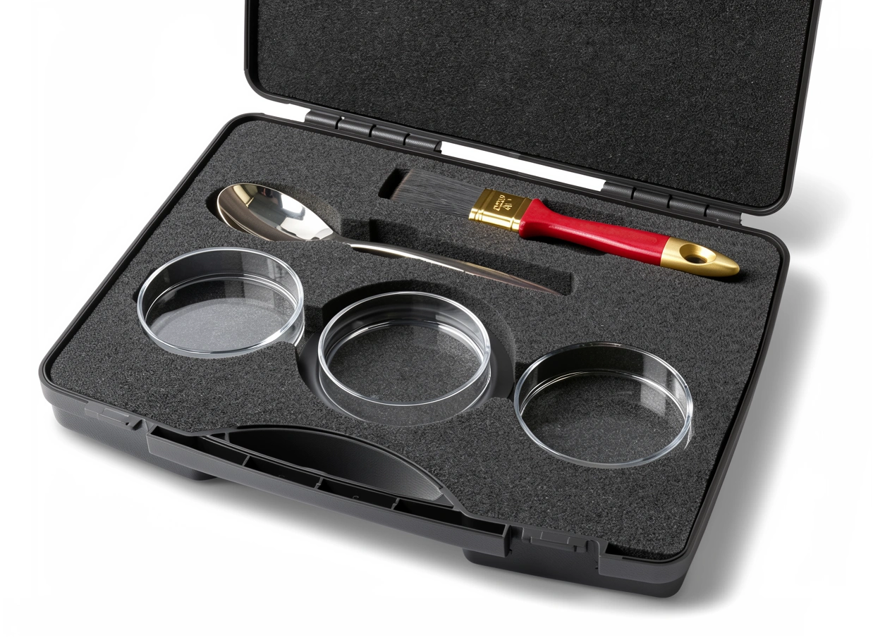 The kit contains three quartz glass cups in a petri dish style, along with a drive ring for magnetic coupling to the SpectraAlyzer 2.0 Top Window. Made from high-quality quartz glass, the cups are optimized for suitable optical characteristics and transmission, supporting reliable sample presentation during measurement. Filling is easy using a spatula or spoon, and a spoon is included in the kit for convenient handling. A brush is also included to facilitate regular cleaning of the glass cups in routine use. All accessories contained in the kit are also available separately.